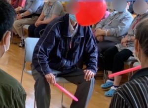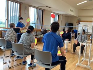 9月のレクレーションでは、「風船バレー」を行いました。3人1組のチームに分かれ、ラケットで風船を撃ち合います。共通のルールは、椅子からは立たないこと。みなさん、椅子に座りながらも、精一杯に腕を伸ばして、カラダを大きく使いながら、相手の陣地に風船を打ち込むことに夢中で楽しみました。
