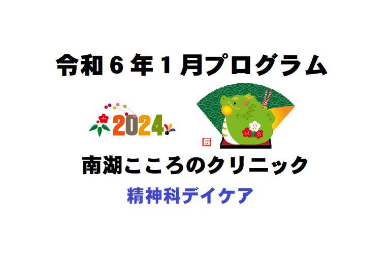 南湖こころのクリニック・精神科デイケアの令和6年1月のプログラム表をアップしました。1月の目玉プログラムは1月16日(火)の「民謡披露」です。民謡の演奏を鑑賞します。令和6年1月4日(木)より、通常診療、精神科デイケアも開始しております。