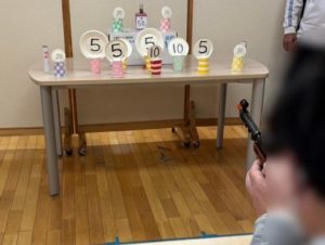 「レクレーション」では、射的を行い「5点、10点、20点、50点」などの点数が書かれた的に当てて競い合います。最高得点の50点は、遠くから小さなビンを落としますが、なんと!今回は、数名が成功しました☆ 皆さん、的に当たるたびに、大きな歓声が上がり、たくさんの笑顔で盛り上がっていました♪