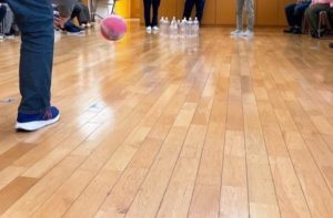 「レクレーション」プログラムでは、ペットボトルを活用した「ボーリング大会」を行いました☆ペットボトルをピンに見立て、ボールを転がします。ピンが勢いよく倒れると、周りからは大きな歓声が!皆さん一体になって、笑顔いっぱいに大きく盛り上がりました♪