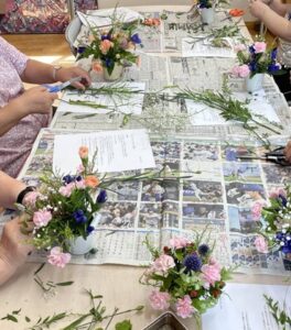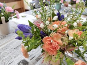 「フラワーアレンジメント」プログラムでは、完成後はそのまま持ち帰って自宅でも楽しめるよう、花器ポットに土台となるオアシスを入れ、切り花を挿して仕上げました♪