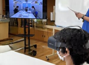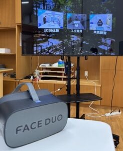 リワークのSSTプログラムは、コミュニケーション能力などを向上させるトレーニングで、日常生活や職場などでの場面やテーマを設定して、ロールプレイ形式で学びます。FACE DUO(VR)ゴーグルを用いることで、場面をリアルに体験することができ、より分かりやすくなります。