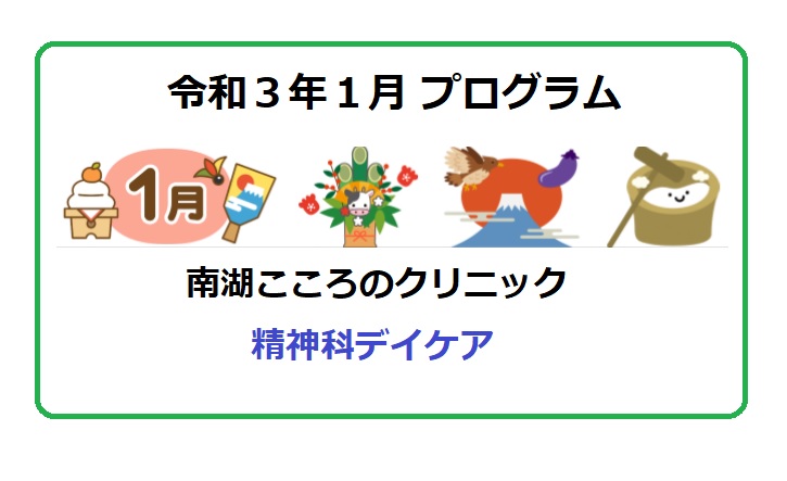 南湖こころのクリニック・精神科デイケアの令和3年1月のプログラム表をアップしました。今月のメインプログラムは「手工芸」。干支の丑を用いたストラップなどを制作する予定です。ぜひご参加ください。